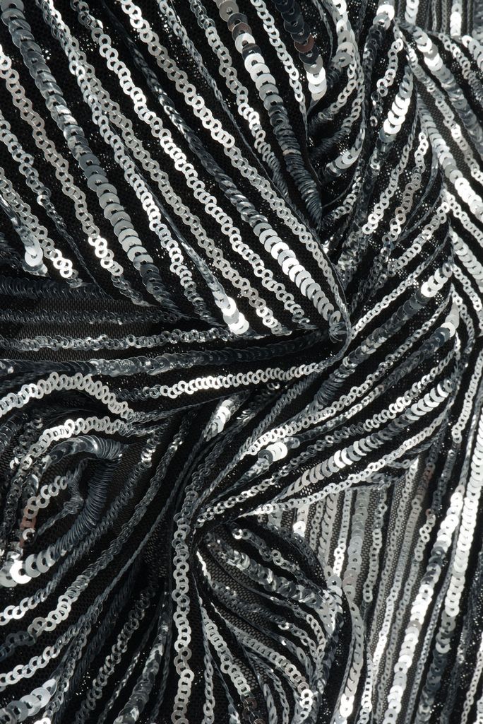 Add sophisticated sparkle with this lace knit featuring detailed embroidery and silver sequins. Crafted from 93% Polyester and 7% Spandex, this 50/57" wide lightweight textured fabric offers soft stretch base. Perfect for blouses, dresses, tunics, skirts, and stylish tops. Adds glamorous shimmer with black and silver contrast. Luxurious fabric for special occasions and statement fashion.