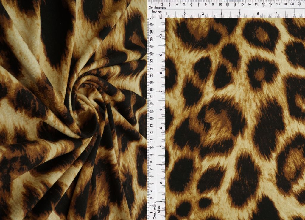 Make a wild fashion statement with this bold animal print brushed DTY knit. Crafted from 96% Polyester and 4% Spandex, this 58/60" wide lightweight cozy fabric features brushed surface for soft smooth hand feel with four-way stretch. Perfect for activewear, biker shorts, bodysuits, blouses, camis, tops, dresses, skirts, and pants.