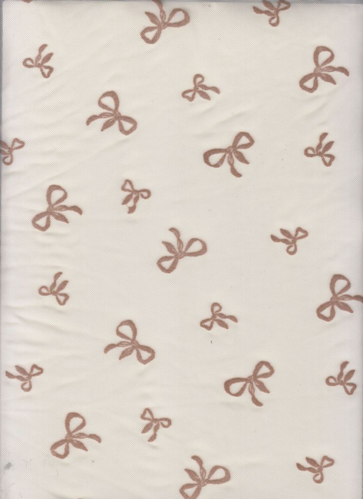 This delicate mesh fabric is crafted from 90% Polyester and 10% Spandex, with a width of 56 to 57 inches. It features charming bow-shaped flocked patterns on a lightweight mesh base, adding a playful and elegant touch to any design. The fabric offers a soft feel, gentle stretch, and breathable texture, making it perfect for tops, dresses, bodysuits, and statement fashion pieces. Ideal for both everyday wear and special occasions, this flocking mesh combines comfort, style, and a whimsical design flair.
